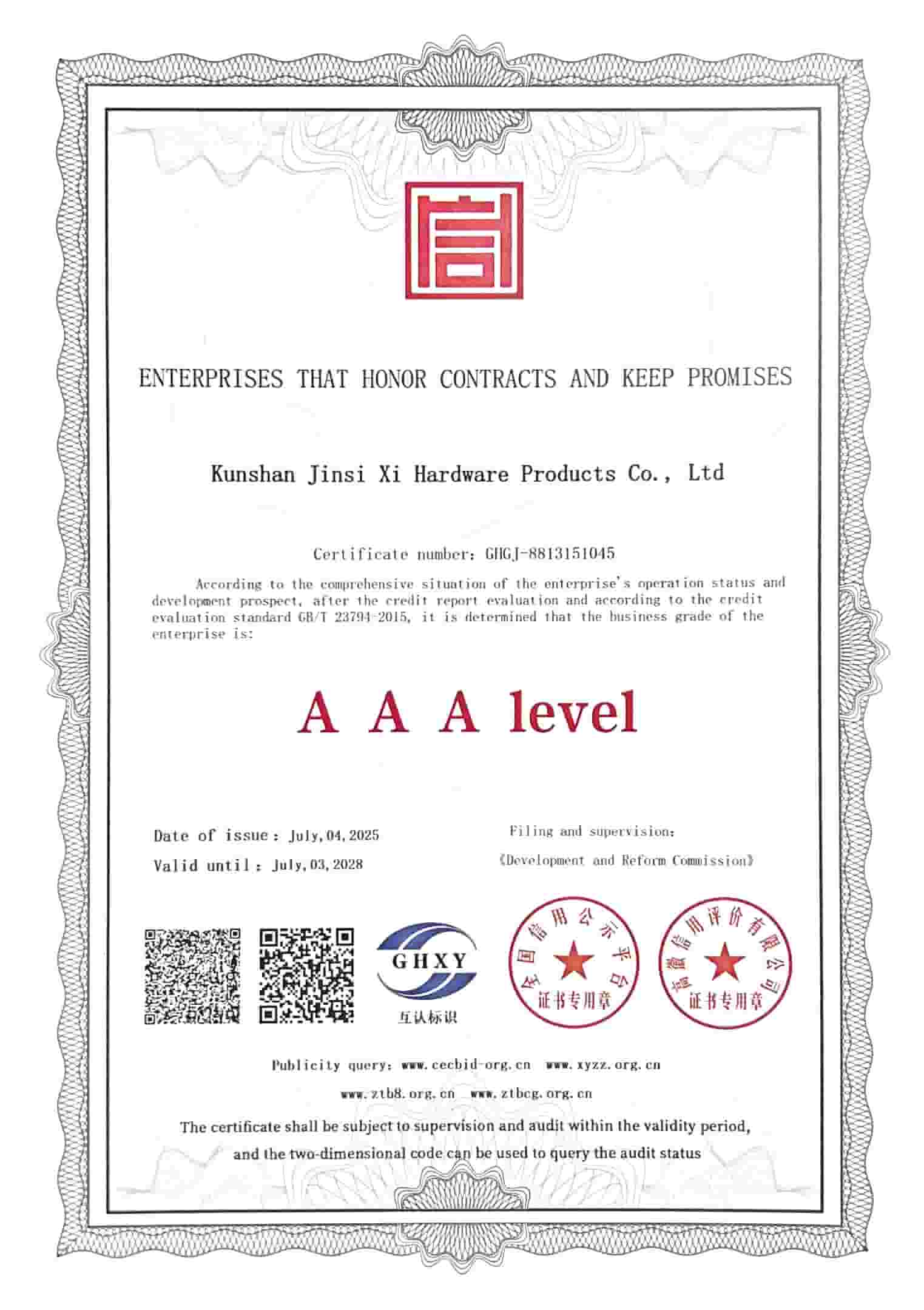 KunshanJINSIXIBronnadh an teideal "Fiontair leibhéal AAA a thugann Conarthaí Onóra agus a Choimeád Gealltanais" ar Metalware Co., Ltd. Tá JINSIXI i gcónaí ag cloí leis an bhfealsúnacht gnó "aontacht agus comhar, dúthracht, sármhaitheas agus foirfeacht", ag feidhmiú le hionracas, ag soláthar seirbhísí ardchaighdeáin do chustaiméirí, agus ar deireadh thiar ag baint amach "comhlíonadh foirfe".